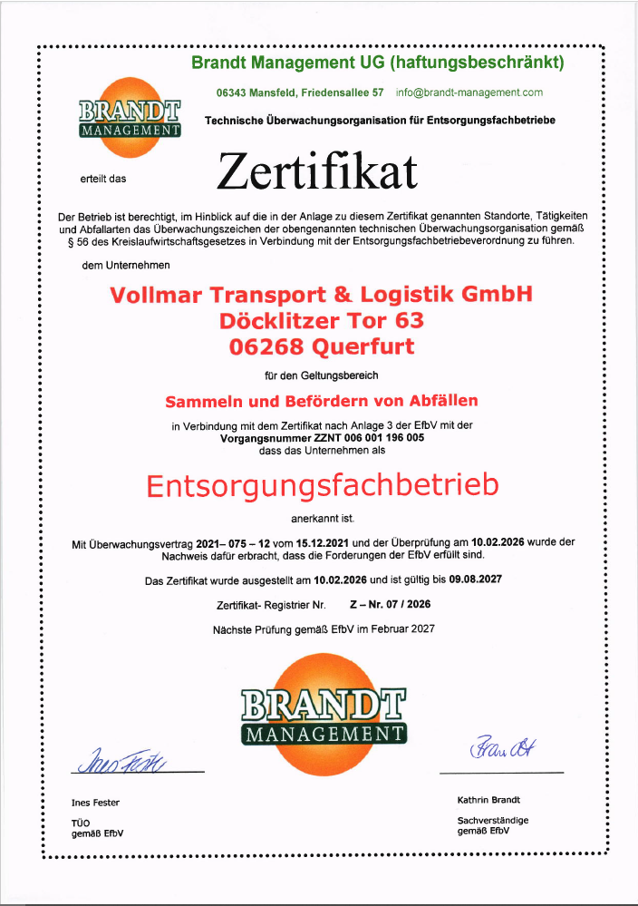 Die Vollmar Transport & Logistik GmbH ist als Entsorgungsfachbetrieb nach § 56 des Kreislaufwirtschaftsgesetzes zertifiziert. Unser aktuelles EFB-Zertifikat bestätigt, dass wir höchste Standards beim Sammeln und Befördern von Abfällen einhalten.